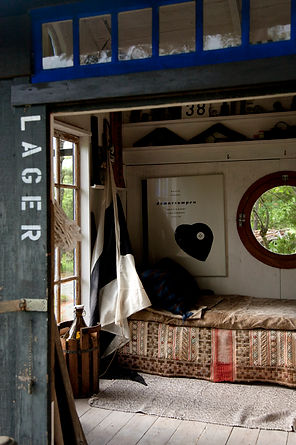 I did not want any dividing walls, but there are fourteen doors that all open (with the exception of a few small windows). I always open a few of the doors depending on which way the wind is blowing, so the out-side world – water, sand, wind, the sound of the trees and the birdsong – has an opportunity to come in.”
